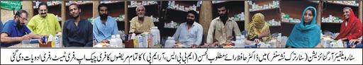 سرگودہا سٹار ویلفیئر آرگنائزیشن کی جانب سےکئی فری میڈیکل کیمپ لگائے گے ہیں لیکن یہ کیمپ ایک اہم قدم ہے جو معاشرے کے ضرورت مند افراد کے لیے طبی سہولیات کی فراہمی کو یقینی بناتا ہے۔ اس کیمپ میں مختلف طبی ماہرین کی خدمات دستیاب ہوتی ہیں جو مریضوں کو مفت معائنہ، تشخیص اور مشورے فراہم کرتے ہیں۔ اس کے علاوہ، ادویات کی مفت تقسیم بھی کی جاتی ہے تاکہ مریضوں کو بروقت اور مؤثر علاج مل سکے۔ یہ کیمپ نہ صرف علاج معالجے کی فراہمی میں مددگار ثابت ہوتا ہے بلکہ صحت کے بارے میں آگاہی بڑھانے میں بھی اہم کردار ادا کرتا ہے۔ اس طرح کی سرگرمیاں معاشرتی بھلائی کے لیے ناگزیر ہیں اور ان سے معاشرے میں مثبت تبدیلی لانے میں مدد ملتی ہے