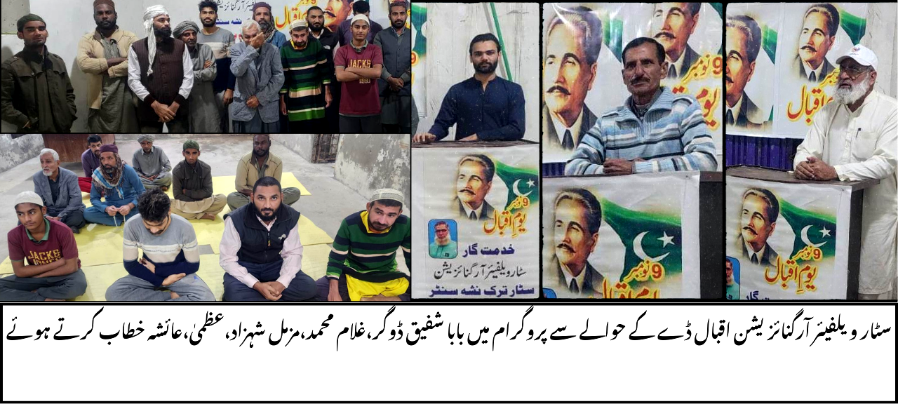 سٹار ویلفیئر آرگنائزیشن میں اقبال ڈے کا پروگرام نہایت جوش و خروش کے ساتھ منایا گیا۔ اس تقریب کا مقصد علامہ اقبال کی تعلیمات اور فلسفہ کو نوجوان نسل تک پہنچانا تھا۔ پروگرام کا آغاز تلاوتِ قرآن پاک سے ہوا، جس کے بعد اقبال کی نظموں کی قرات اور ان کے فلسفہ کے بارے میں تقاریر پیش کی گئیں۔ صدر سٹار ویلفیئر آرگنائزیشن خدمت گار بابا محمد شفیق ڈوگر نے اقبال کی خدمات کو خراج تحسین پیش کیا اور ان کے فکر کو آج کے دور میں اپنانے کی اہمیت پر زور دیا۔ تقریب میں غلام محمد ،مزمل شہزاد عظمٰی ،عائشہ نے اقبال کے اشعار پیش کر کے ان کی شاعری کی روشنی میں اپنے خیالات کا اظہار کیا۔ اس موقع پر صدر سٹار ویلفیئر آرگنائزیشن خدمت گار بابا محمد شفیق ڈوگر نے علامہ اقبال کی تعلیمات کو اپنی زندگیوں میں شامل کرنے کا عزم کیا۔ پروگرام کا اختتام قومی ترانہ کے ساتھ ہوا، جس کے بعد حاضرین میں چائے اور ریفریشمنٹس تقسیم کی گئیں۔