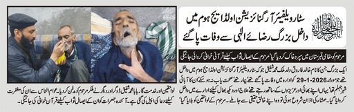 The deceased was buried in the local cemetery, Quran recitation will be held to convey the deceased's blessings An elderly person named Khalid Farooq son of Malik Muhammad Shafiq, who was admitted to the Star Welfare Organization Old Age Home, who died in the institution on 29-1-2026, was sick, could not recover, his hometown was Jhelum, he lived here with his brother and relatives, he was admitted to the institution for treatment and care. When the Isha call to prayer began, he went to meet his true creator. The relatives of the deceased were called, the relatives and the servant Baba Muhammad Shafiq Dogar and others together buried the deceased. An appeal has been made to the public to pray for his forgiveness. Quran recitation will be held next Thursday to convey his blessings.