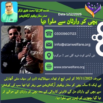 تھانہ سیٹلایٹ ٹاون ایس ایچ او اور سیف سٹی آتھارٹی کی وجہ سے بچی کو سٹار ویلفیئر آرگنائزیشن پہنچا دیا گیا بچی کی عمر6 سال ہے بچی کے وارثان کی تلاش ہے اگر کوئی اس بچی کو جانتا ہو پہچانتا ہو تو سٹار ویلفیئر آرگنائزیشن(سٹار محمدی آغوش میں یہ بچی موجود ہے دئیے گے نمبر پر رابطہ کریں۔