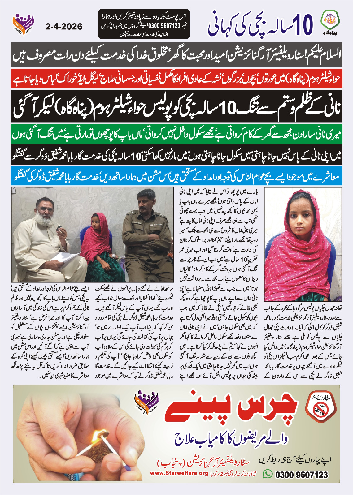 تھانہ جھال چکیاں پولیس سرگودہا کے محرر کے جانب سے صدر سٹار ویلفیئر آرگنائزیشن خدمت گا ر بابا محمد شفیق ڈوگر کو کال آئی کہ ایک لا وارث بچی جھال چکیاں سے پولیس کو ملی ہے جسے سٹار ویلفیئر آرگنائزیشن حواء شیلٹر ہوم (پناہ گاہ) میں داخل کیا جائے جس کے بعد محمد اکرم سب انسپکٹر اس بچی کو لیکر ادارے میں آ گئے جہاں پر خدمت گا ر بابا محمد شفیق ڈوگر نے بچی سے اس کے وارثان کے بارے میں پوچھا تو اس نے بتایا کہ میں اپنی نانی اماں کے پاس رہتی ہوں‘ مجھے میرے ماں باپ یا بہن بھائیوں کا کچھ پتہ نہیں‘ میں جب بہت چھوٹی تھی تب سے ہی مجھے صرف اپنی نانی اماں کا پتہ ہے‘ میری نانی اماں کا شروع سے ہی مجھ سے ہتک آمیز رویہ تھا‘ مجھے مارنا پیٹنا‘ جھڑکنا اور برا سلوک کرنا ان کی عادت ہے‘ وقت گزرتا گیا اور اب میری عمر تقریباً 10 سال ہے‘ میں اب ان کے ٹارچر سے تنگ آ گئی ہوں‘ ہر وقت گھر کے کام کروانا‘ گالیاں دینا ان کا معمول ہے‘ اب مجھ سے یہ برداشت نہیں ہو تا‘ میں نے جب سے تھوڑا ہوش سنبھالا ہے اپنی نانی اماں سے اپنے ماں باپ کا پوچھا ہے مگر وہ کچھ بھی بتانے کو تیار نہیں‘ بچی نے بتایا کہ میں جب بچوں کو سکول جاتے دیکھتی ہو تو میرا بھی دل کر تا ہے کہ میں بھی سکول جاؤں‘ میں نے اپنی نانی اماں سے متعدد دفعہ مجھے سکول داخل کروانے کا کہا مگر انہوں نے کہا کہ تم نے پڑھ لکھ کر کیا کرنا ہے۔ میں کچھ دنوں سے ان کے رویہ سے شدید تنگ آ گئی ہوں اب میں گھر نہیں جانا چاہتی میں ایک بیکری پر بیٹھ گئی جہاں پر پولیس انکل آئے اور مجھے اپنے ساتھ تھانے لے گئے وہاں پر انہوں نے مجھے بسکٹ لیکر دئیے‘ کھانا کھلایا اور مجھ سے سوال جواب کیے اور اب مجھے یہاں آپ کے پاس لیکر آ گئے ہیں۔ خدمت گا ر بابا محمد شفیق ڈوگر نے بچی کی تمام روداد سن کر کہا کہ بیٹا اب آپ ایک ادارے میں ہو‘ جہاں پر آپ کی کفالت کی جائے گی‘ یہاں پر آپ کو ہر قسم کی سہولت دی جائے گی اس کے علاوہ آپ کو سکول بھی داخل کراویا جائیگا‘ آپ کی تعلیم و تربیت کیلئے انتظامات کیے جائیں گے۔ خدمت گا ر بابا محمد شفیق ڈوگر نے کہا کہ معاشرے میں موجود ایسے بچے عوام الناس کی توجہ اور امداد کے مستحق ہیں‘ یہ بچی جس کو اپنے ماں باپ کا کچھ پتہ نہیں اور ظالم نانی کے رحم و کرم پر ہے اس کی زندگی میں آسانیاں پیدا کرنا آپ کا اور میرا فرض ہے‘ سٹار ویلفیئر آرگنائزیشن ایسے سینکڑوں بچوں کے مستقبل کو سنوار چکی ہے اور یہ مشن جا ری و سا ری ہے‘ میری آپ سے اپیل ہے کہ آگے آئیں اور اس مشن میں ہمارا ساتھ دیں‘ ایسے مستحق بچوں کیلئے اپنی گرہ کے مطابق ضرور امداد کریں تاکہ کل یہ بچے پڑھ لکھ معاشرے کا مفید شہری بن سکیں۔