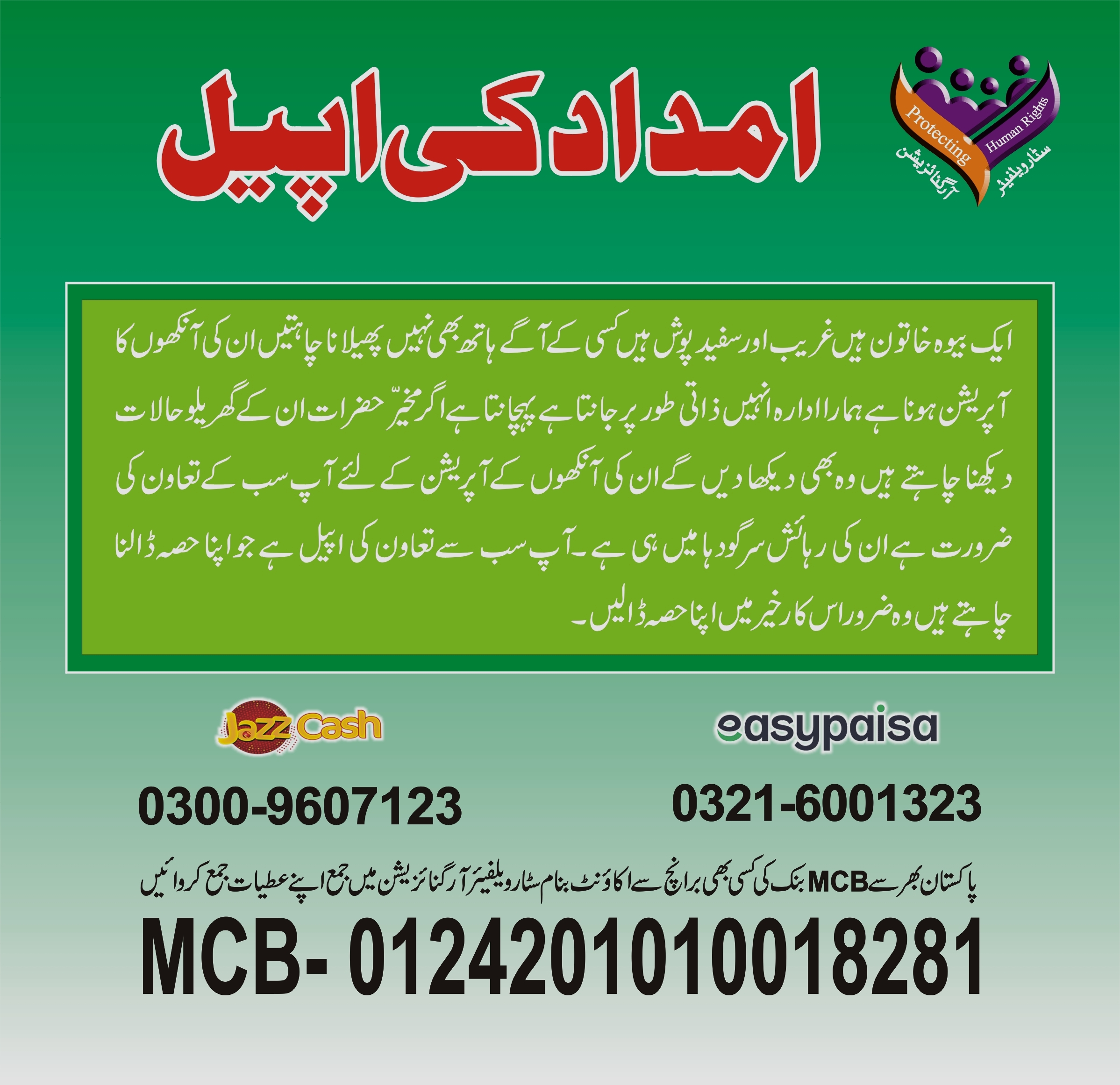 ایک بیوہ خاتون ہیں غریب اور سفید پوش ہیں کسی کے آگے ہاتھ بھی نہیں پھیلانا چاہتیں ان کی آنکھوں کا آپریشن ہونا ہے ہمارا ادارہ انہیں ذاتی طور پر جانتاہے پہچانتا ہے اگر مخیر حضرات ان کے گھریلو حالات دیکھنا چاہتے ہیں وہ بھی دیکھا دیں گے ان کی آنکھوں کے آپریشن کے لئے آپ سب کے تعاون کی ضرورت ہے ان کی رہائش سرگودہا میں ہی ہے۔آپ سب سے تعاون کی اپیل ہے جو اپنا حصہ ڈالنا چاہتے ہیں وہ ضرور اس کار خیر میں اپنا حصہ ڈالیں۔ بیوہ خاتون کا آنکھوں کا آپریشن ہونا ہے آپ سب کے تعاون کی ضرورت ہے مورخہ 23/04/2025 کو آنکھوں کا آپریشن ہونا ہے آپریشن کی تاریخ ڈاکٹرز نے دے رکھی ہے اللہ کے بندوں سے مدد کی اپیل ہے صدقہ جاریہ سمجھ کر آگے شئیر ضرور کریں ۔ٹوٹل اخراجات پندرہ ہزارروپے ہیں۔